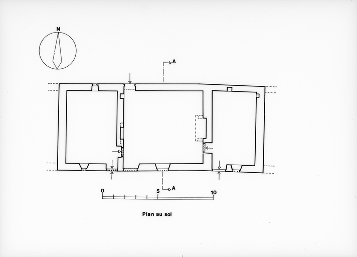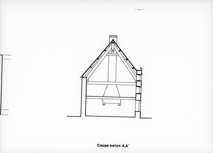 Orientée au sud et perpendiculaire à l´axe de circulation, cette belle maison rurale est construite entièrement en pierre coquillière des faluns, hormis les portes jumelées en plein-cintre qui sont en granite fin de Languédias. Ce logis est dit à fonctions combinées car il regroupe sous une même toiture des parties d´exploitation et des parties d´habitation. Cette mixité des usages se perçoit ici sur deux niveaux. Le rez-de-chaussée regroupe deux pièces sans feu qui encadrent une salle chauffée. Les trois pièces communiquent entre elles et possèdent également leur propre distribution extérieure. Un escalier intérieur en bois devait permettre l´accès à une chambre haute qui était entourée de greniers. Deux inscriptions sont portées sur la façade : la première est située à l´est sur la porte haute droite : LAN DE GRACE 1631/LANES A ETE BIENHERE/AISIN COME : VOV ME/YIE : GUILLAUME PERRIN/MA FET FERE ; qui se lit l´an de grâce 1631 l´année a été bienheureuse ainsi comme vous me voyez. Guillaume Perrin m´a faite faire. La deuxième inscription est gravée sur le linteau de la fenêtre à barreaux de l´étage, elle est partiellement lisible, se devinent la date 1698 et un prénom : IVLIEN (..).