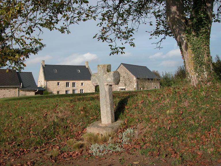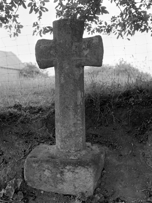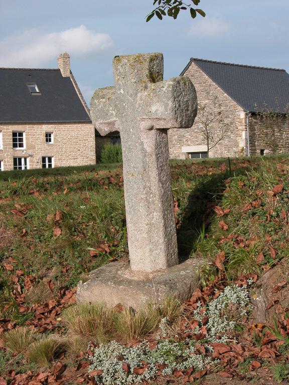 Croix monolithe de granite fichée dans une base également de granite. Bras et fût de section polygonale. Deux boules en décor sous les bras de la croix.