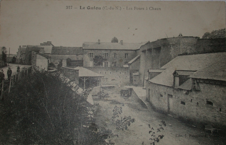 Les fours à chaux du Quiou sont édifiés en 1892 par J.-M. Bougeard, entrepreneur de travaux publics demeurant à Médréac (35). Il s'agit de quatre fours à chaux permanents (ou fours continus à courte flamme) produisant de l'amendement pour les terres et dont l'installation présente alors un grand intérêt pour l'agriculture du pays. L'usine est inaugurée le 20 février 1892 comme l'atteste la date portée sur la partie haute des fours. Dans une lettre adressée au préfet et datée du 18 septembre 1891, J.-M. Bougeard précise que les fours ne produiront que de la chaux grasse de première qualité. Le calcaire utilisé est extrait d'une carrière située tout près du site chaufournier, au sud-ouest. Plusieurs facteurs sont à l'origine de la création de l'usine de chaux du Quiou : l'année 1892 correspond à la création de la ligne de chemin de fer la Brohinière-Dinan qui a une incidence directe sur l'acheminement des matières premières (anthracite) et l'exportation des produits finis, à l'instar du canal d'Ille-et-Rance. C'est également le début du syndicalisme agricole. L'établissement ne fonctionnera réellement qu'avec trois des quatre fours puisque l'un d'entre eux a été rapidement endommagé par une infiltration d'eau qui le rend très vite hors d'usage. Une lettre de la mairie du Quiou, datée du 18 janvier 1892, confirme la disposition actuelle des fours à savoir que : " les fondements de l'établissement [sont situés] à 7 m et les bouches des fours à chaux à 5 m au moins au-dessous du niveau du sol " . Au début du 20e siècle, un manège à chevaux permet de broyer les mottes de chaux mal cuite. En 1905, la carrière de sablon calcaire d'où est extraite la matière première, située à l'arrière des fours, consiste en une excavation de 2 m de profondeur dans le calcaire proprement dit, sur 4 m de longueur et de largeur. Les fours restent entre les mains de la famille Bougeard jusqu'en 1937, année au cours de laquelle ils sont vendus à monsieur Lemesle qui leur adjoint une fabrique de parpaings ; à la fonction première de fabrication de chaux destinée aux engrais, s'ajoute donc celle de production de matériaux de construction. L'usine est ensuite vendue à la Timac implantée à Saint-Malo (35). Les fours à chaux cessent leur activité vers 1973-1974. L'écurie, le manège à chevaux et les quais de chargement n'existent plus. Actuellement, le site est intégré dans une propriété privée. De source orale, l'usine aurait fonctionné avec un moteur diesel. En 1905, la carrière de sablon calcaire exploitée par J.-M. Bougeard donne du travail à deux salariés.