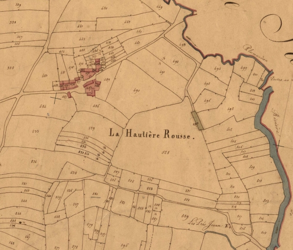 La présence d’un grand bassin visible en parcelle 497 du cadastre de 1833, proche de ce hameau au sud-est et près du cours de la Rance pourrait être à rapprocher du toponyme la Hautière Rousse. Le qualificatif de « rousse » étant lié au rouissage du lin et du chanvre dans des bassins de décantation, opération qui donnait à l’eau une couleur rousse et une odeur nauséabonde.Le hameau de la Hautière Rousse présente entre autres particularités de conserver un ensemble de logis de caractère qui remontent au 17e et 18e siècles et dont trois portent les dates de : 1751, 1777, 1784 et deux le nom de leurs commanditaires : Jean Biffart et son épouse Jeanne Louvet pour la maison située à l’ouest de l’écart (Logis 1), Maitre et Dame Des Rionnais (un Nogues des Rionnais, avocat, est mentionné en 1774 lors de la pose de la première pierre du clocher d’Evran).Sur l’ensemble de ces logis se démarque un haut logis couvert en partie d’un toit à une seule croupe avec lucarnes donnant sur la cour et sur le chemin vicinal. Ce grand logis qui remonte pour sa partie la plus ancienne au 17e siècle a été repris en 1777 comme l’atteste la date portée sur une pierre entre les deux fenêtres de l’étage. Ce logis peut être la résidence d’un certain Jean Haouissé, sieur des Grands Champs qui décède au village de la Hautière Rousse en 1705.