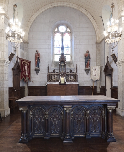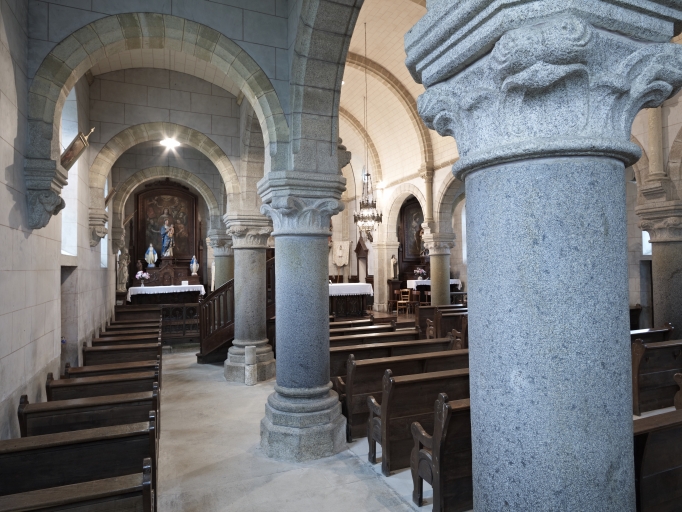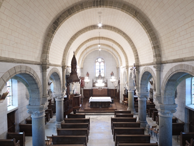 De plan allongé à trois vaisseaux, elle est terminée par un chevet plat orienté au nord. Son gros oeuvre est en pierre de taille de calcaire coquillier tandis que les encadrements de ses baies et les chaînages des angles sont en granite bleu probablement du Hinglé. Les cinq travées de la nef sont rythmées par des arcs doubleaux en pierre de taille qui reposent sur les tailloirs des piles monolithes par l´intermédiaire de colonnettes. Ces mêmes travées sont marquées dans les collatéraux par des arcs diaphragmes qui reposent sur des culots sculptés. Le revers de la tour porche présente une tribune accessible par une vis d´escalier.