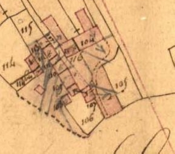 La porte d’accès à la sacristie de l’église de Tréfumel datée de 1660, également ornée de pilastres bagués peut servir de référence pour dater la première campagne de construction. Un autre exemple similaire, à la Villauray est associé à une date de 1677. La très forte saillie des chapiteaux qui surmontent les pilastres (une vingtaine de centimètre) semble destinée à recevoir la structure de bois d’un auvent. Quelques éléments de décor, tels que la tête d’ange, la corniche à modillons et le jour en forme de canonnière témoignent de l’aisance du commanditaire. Le prolongement du logis en 1810, malgré sa simplicité conserve le même souci de qualité.La représentation du bâti sur le cadastre de 1833 pose une fois de plus la question de son organisation et de la nature des relations entre le logis principal et les logis secondaires. Il s’agit d’un exemple parmi tant d’autres dans lequel le découpage de propriété évolue dans le temps et ne correspond pas aux unités d’habitation d’origine.
