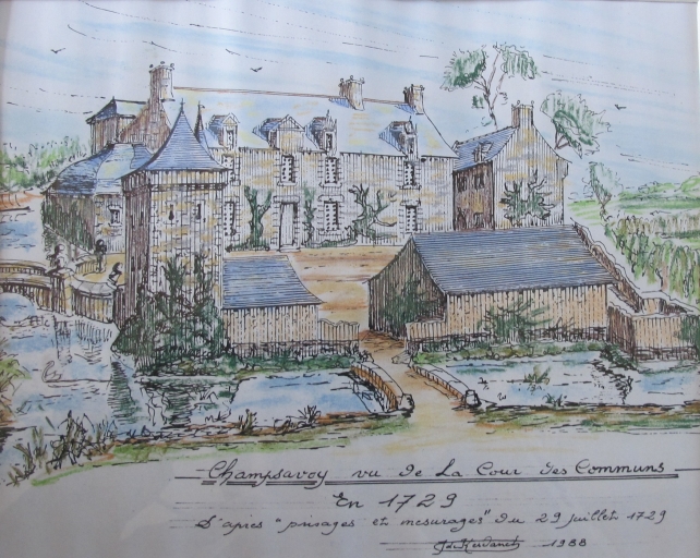 Le fief de Champsavoy est mentionné dès 1346 à la famille Grignard, comme une partie détachée de l´ancienne seigneurie de Thélosouc, au profit d´un cadet. Il demeure dans cette famille jusqu´à la Révolution et passe par alliance aux Bouan du Chef du Bos au début de la Révolution. Le manoir dévasté durant les guerres de la Ligue fut reconstruit entre la fin du 16e siècle et le début du 17e siècle. Le journal de François Grignard (1551-1607) publié à la fin du 19e siècle fait état des agrandissements et transformations du manoir et de l´aménagement des abords (vois annexe 1). Une pierre en forme d´arc surbaissé portant avec les armes Grignard, la date de 1605, les monogrammes de François Grignard associé à ceux de Françoise Levesque sa première épouse et de Rollande de la Bouexière sa deuxième épouse a été retrouvée près du pignon est. Elle est à rapprocher de la mention du journal selon laquelle François Grignard fait refaire en 1605 le grand portail de la cour. Le logis actuel peut remonter à la première moitié du 16e siècle. Une partie de la façade arrière actuelle construite en pierre de taille des faluns avec deux fenêtres superposées chanfreinées et pourvues d´appuis moulurés correspond peut-être à la façade principale du logis primitif. A cette période se rattachent deux fenêtres dans la partie ouest de la façade nord, la lucarne qui les surmonte ainsi que les deux cheminées monumentales conservées au rez-de-chaussée du logis. L´une à l´est est sculptée des armes d´alliance de Jean Grignart avec Guillemette de la Provosté qui se marient en 1484. Des travaux ponctuels sont effectués au cours de la seconde moitié du 17e siècle : un grand fronton armorié est ajouté au centre de la façade. On peut l´associer soit au mariage de Guy-Henri Grignart avec Marie-Sébastienne de Begasson le 31 Octobre 1686 ou à celui de René Henri Grignart avec Marie Judith de Bruslon le 24 février 1716. Le logis n´est plus régulièrement habité au début du 18e siècle et sert de retenue : un partage successoral de 1729 décrit l´ensemble des bâtiments (annexe 2). Après la vente de la terre à la Révolution le logis est réduit à ses dimensions actuelles et plusieurs bâtiments sont détruits. Le colombier, encore représenté sur le cadastre de 1844, disparaît au cours de la seconde moitié du 19e siècle. L´appentis monté du côté ouest remploie des colonnes provenant du manoir de la Garde en Evran.