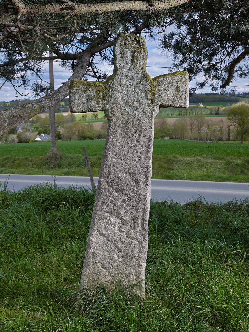 En hauteur de la route qui mène à Plouasne, cette croix de granite monolithique présente une forme particulière, un fût évasé, des bras courts et pattés autour d´un cercle qui indiquent son ancienneté. Son originalité provient de son décor gravé de motifs celtiques : le cercle (au centre de la croix), des motifs géométriques et des entrelacs (sur le fut). Elle est ornée seulement dans sa partie face, le revers présente des traces d´épannelage du fût.