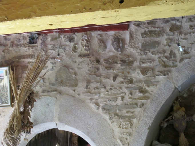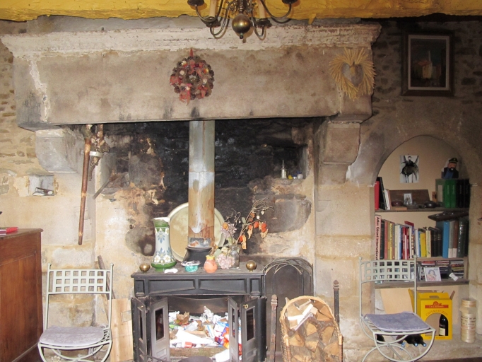 Le gros oeuvre construit en moellons de granite était à l´origine chaulé pour laisser apparaître les encadrements en pierre de taille de granite plus fin de Languédias et la corniche à modillons en pierre calcaire des faluns. Autrefois composé de trois pièces au sol, le logis a été divisé en deux propriétés. Il conserve toutefois le volume complet de la salle avec sa cheminée monumentale à linteau arrondi, son vaisselier mural assemblé avec une porte intérieure de communication. Au-dessus de celle-ci deux niches à oiseaux de compagnie ou de chasse ? ont été murées. Une photo prise avant restauration indique dans l´angle nord est de cette pièce un escalier droit de charpente selon un modèle courant à balustres plats qui menait à la chambre de l´étage et au grenier. Les murs intérieurs étaient chaulés de blanc en partie haute avec un soubassement teinté. Dans le mur gouttereau nord de la maison a été retrouvé par le propriétaire actuel une hache polie. Il n´est pas rare en effet d´en rencontrer dans les murs en guise de protection. La hache polie appelée pierre de foudre écarte l´orage et préserve ainsi l´homme et son bétail.