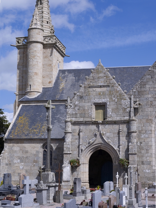 En raison de son mauvais état attesté dès 1828, l'église a été reconstruite entre 1847 et 1849 par l'architecte et entrepreneur Charles Kerleau à l'exception du massif occidental de la tour (achevée en 1669), du clocher et du porche sud datables du 17e siècle. Le porche porte l'inscription suivante : "Cette partie fut bâtie l'an 1847". On notera le soin accordé à l'ornementation des crossettes sculptées dont l'une en fût de canon. Sous le porche avec lierne et clef pendante se trouve, engagée dans la maçonnerie, la statue en granite d'une Vierge à l'enfant accompagnée d'armoiries.
