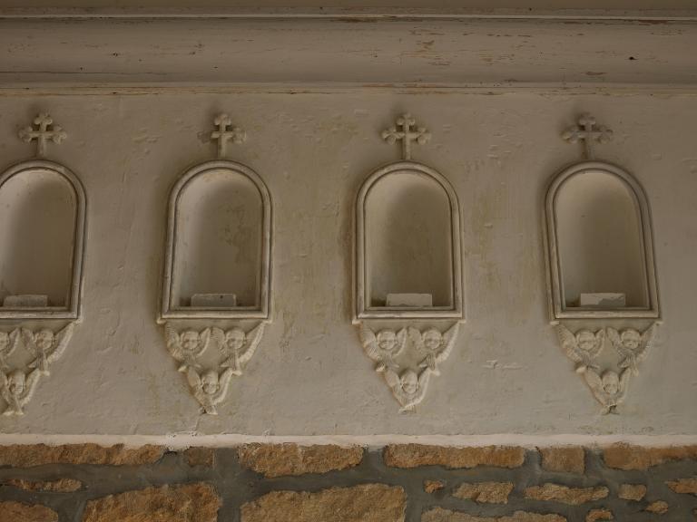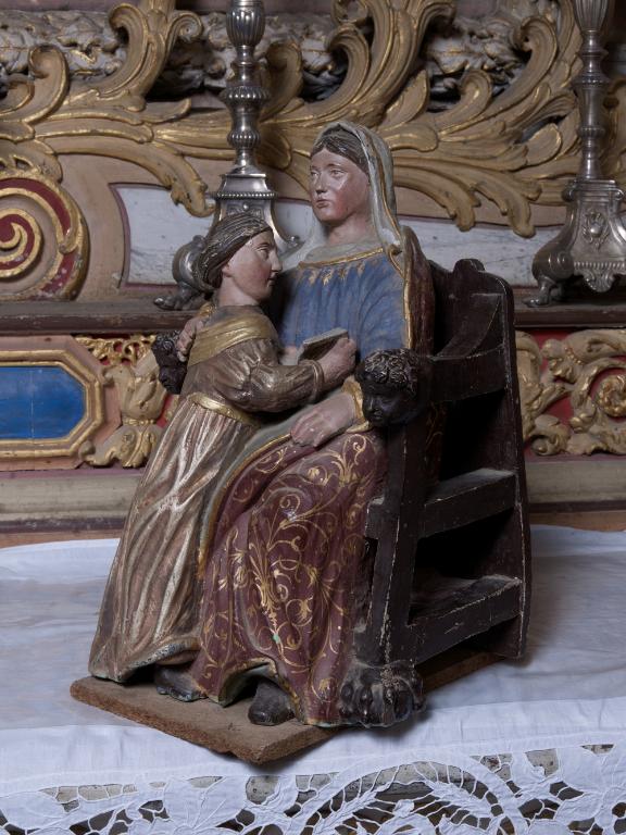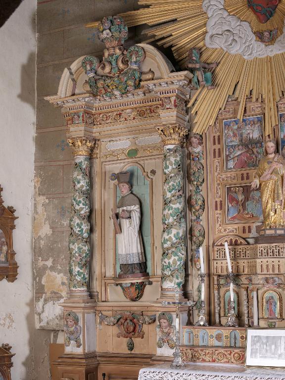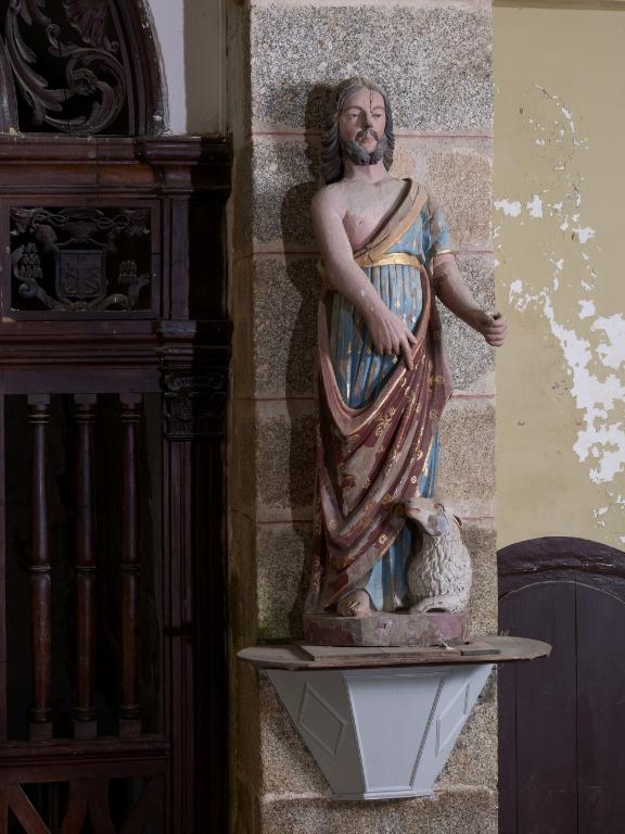 - statues anciennes en bois polychrome de la sainte Vierge, sainte Anne, saint Pierre (avec la tiare et la tenue de pape), saint Paul (un ouvrage sous le bras...), saint Yves, saint Jean-Baptiste (en manteau drapé, appuyé sur un bâton cruciforme et un agneau à ses pieds symbole du sacrifice à venir du Christ...)