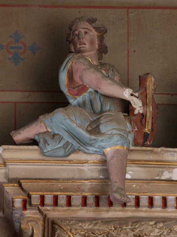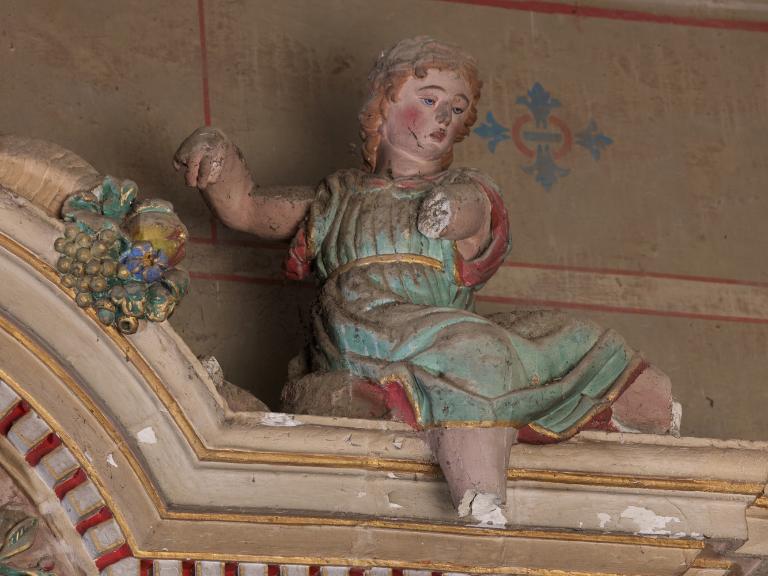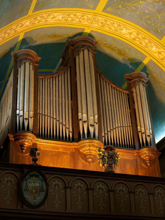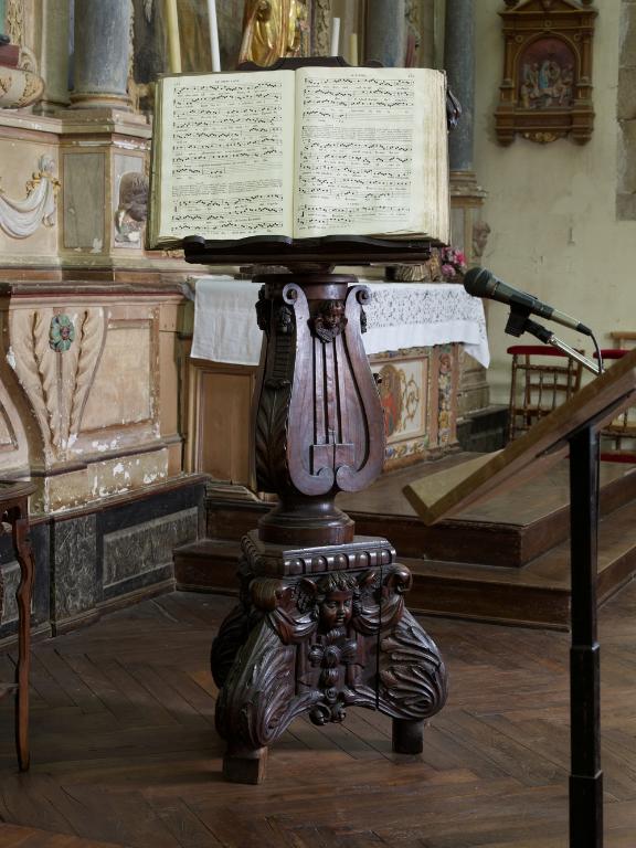 - chaire suspendue (18e siècle). L'abat-voix (dôme ou dais, placé au-dessus de la chaire afin de renvoyer la voix du prédicateur) est orné d'une colombe, symbole du Saint-Esprit.