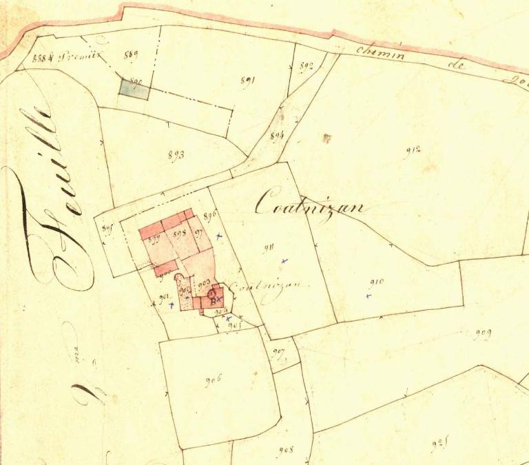 Du manoir ou château de Coat Nizan ne subsistent que les douves et leurs murs d'enceinte qui entourent le domaine, des dépendances du 17e siècle, ainsi qu'une vasque monolithe du 16e siècle qui ornait le jardin. L'acte de prisage et partage de 1828 mentionne les douves, le jardin au sud et à l'est du manoir avec "défenses et treillis d'épines en son endroit et y compris les ruines de la tourelle qui existent bout nord du dit jardin". La passerelle qui franchit la douve au nord est moderne. Sur le cadastre ancien de 1834, le manoir est encore figuré avec son plan en L, sa tour d'escalier, et un grand bâtiment en retour qui semble en ruines. Le manoir est entièrement démantelé en 1838 pour construire, à quelques mètres au nord, la nouvelle maison de Guillaume Clech. Ce paysan propriétaire hérite du manoir que ses parents, Yves Clech et Yvonne Prigent, ont acquis comme bien national le 29 août 1794, avec le moulin qui en dépend, la métairie et plusieurs convenants alentour (dont Convenant L'Hostis). Les pierres de l'ancien manoir fournissent un matériau de premier choix pour la nouvelle construction, dans laquelle sont également remployées des cheminées du 16e siècle. La tour d'escalier rectangulaire, sur la façade postérieure, est un pastiche de l'architecture nobiliaire.
