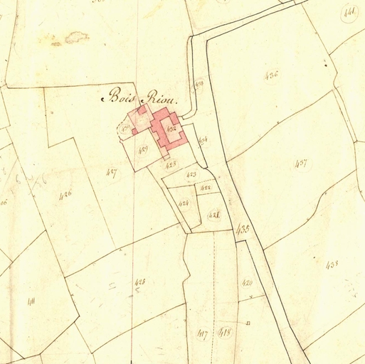 Le manoir du Bois Riou est vraisemblablement datable de la seconde moitié du 16e siècle voire du tout début du 17e siècle (1580-1610). Il a été déclassé en ferme à une date indéterminée. Le dessin de Henri Frotier de la Messelière a été réalisé en juin 1929 : il nous montre l'état originel du manoir avec ses deux lucarnes ouvragées.