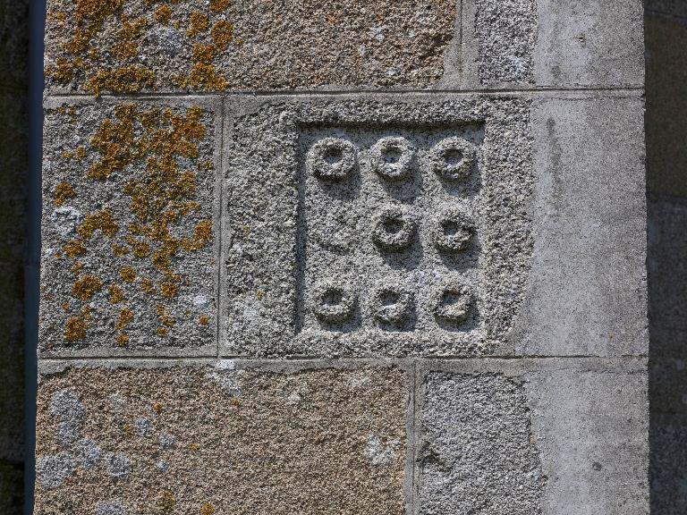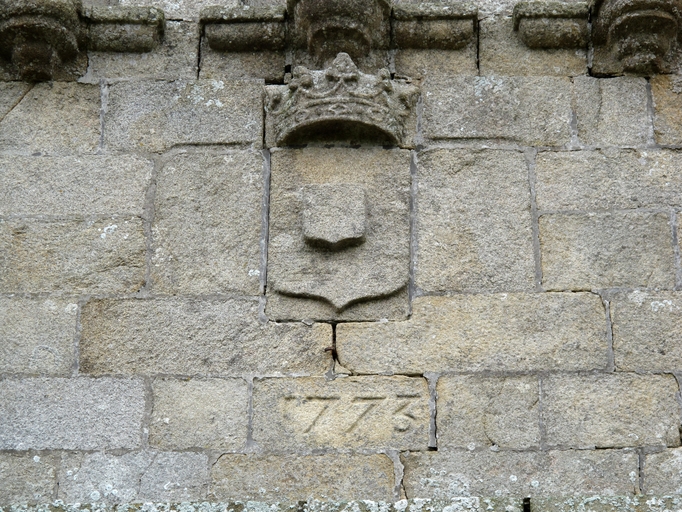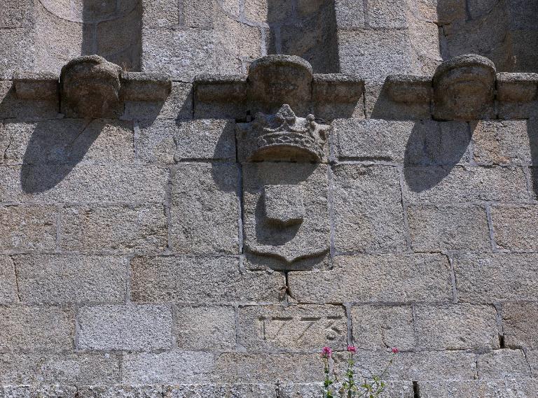 - tour-clocher (jusqu'à la balustrade) - de style néo-classique, datée de 1773 et surmontée d'armoiries (martelées pendant la Révolution) ;