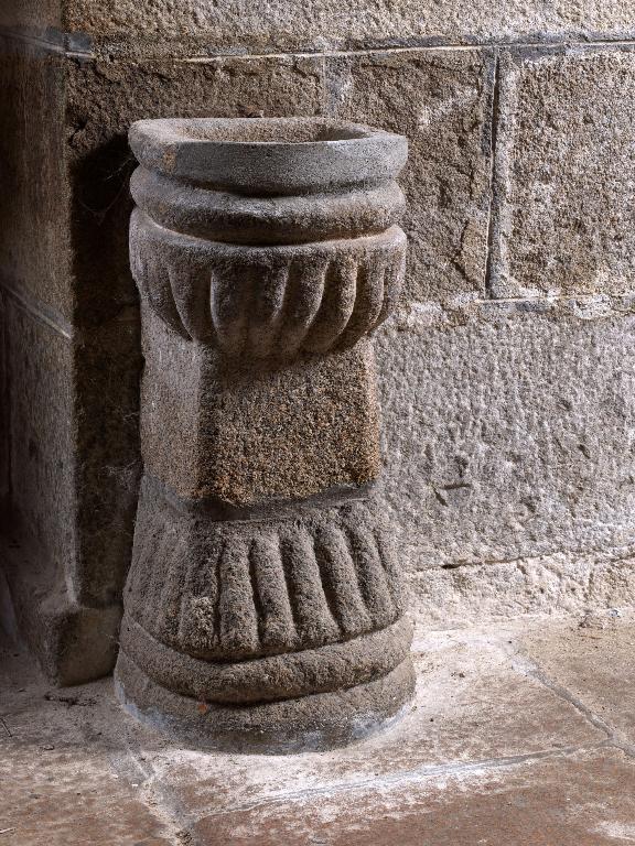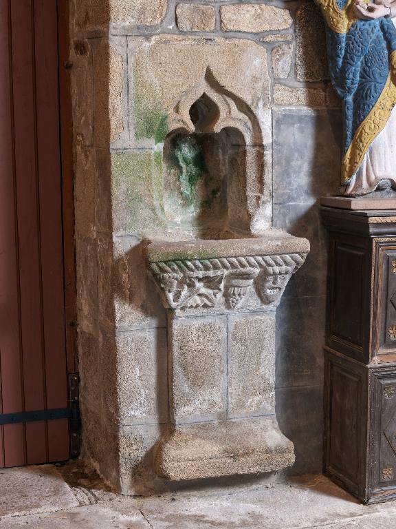 - un bénitier mural en granite sculpté du 13e siècle (?) (classé au titre objet en 1911) ;