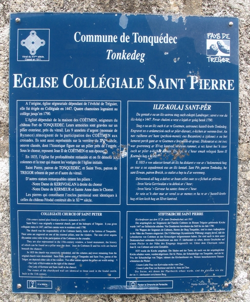 L'église paroissiale de Tonquédec est dédiée à saint Pierre. Son édification a été financée par la maison de Coëtmen, seigneur du château fort de Tonquédec, dont les armoiries "De gueules aux neuf annelets d'argent 3,3,3" figurent dans la verrière, sur un pilier et sur l'un des contreforts du chevet. Sous le chœur repose Jean II de Coëtmen (mort en 1496) et son épouse Jeanne du Pont. A la demande de Rolland de Coëtmen, l'église a été érigée en collégiale par bulle pontificale du 17 août 1447 alors que Jean de Ploeuc est évêque de Tréguier (1442-1453). En tant que collégiale, l'église de Tonquédec - devenue église capitulaire, a été confiée à un chapitre collégial constitué de plusieurs chanoines et d'un supérieur nommé prévôt.