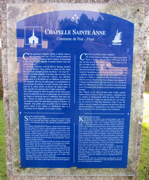 Chapelle dédiée à sainte Anne élevée en 1776 par Callart de la Villeneuve. Elle a été restaurée au 19e siècle (clocher et aile). Une inscription rappelle la mémoire de François Le Fiblec, recteur de Prat décédé le 16 avril 1865 et donateur de la chapelle. Sur le placître, croix datée de 1775.
