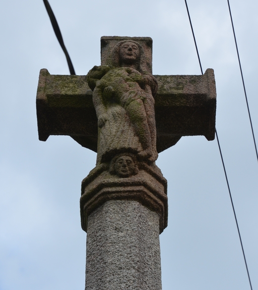 Emmarchement à trois degrés, soubassement à table débordante portant un socle cubique, fût à la base carrée puis octogonale se terminant par un nœud (avec un angelot) et une croix à double face. Christ en croix représenté mort, les bras fléchis, et Pietà ou Vierge de pitié (représentation de la la Vierge Marie en Mater dolorosa, mère pleurant son enfant qu'elle tient sur ses genoux, en l'occurrence le Christ descendu mort de la Croix avant sa mise au tombeau). Le socle de la croix porte l´inscription et le millésime suivant : "Jésus Sauveur du monde, ayez pitié de nous et sauvez-nous" et "F. F. Par Yves Nicol, Vf [veuf] de Renée Briand et ses enfants, 1834".