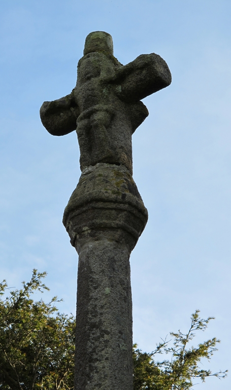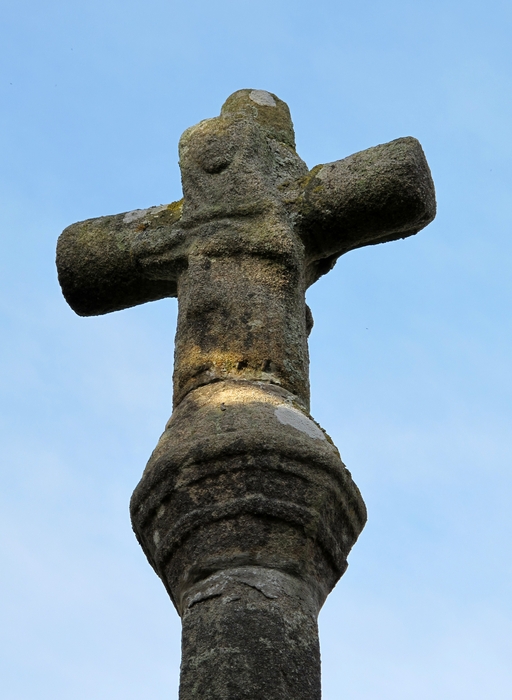 Croix en granite située sur le placître immédiatement au nord-ouest de la chapelle Sainte-Anne. Emmarchement à trois degrés et piédestal de plan octogonal, socle parallélépipédique, fût à base carrée puis octogonale, nœud et croix sommitale datée par millésime de 1775. Représentation, vers le nord d'un Christ en croix (vivant) et, vers le sud de sainte Anne.