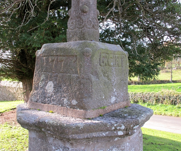 Socle portant des inscriptions et une date (177?). Croix sommitale datée par millésime de 1775.