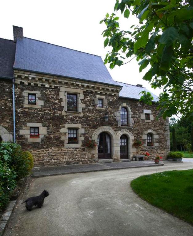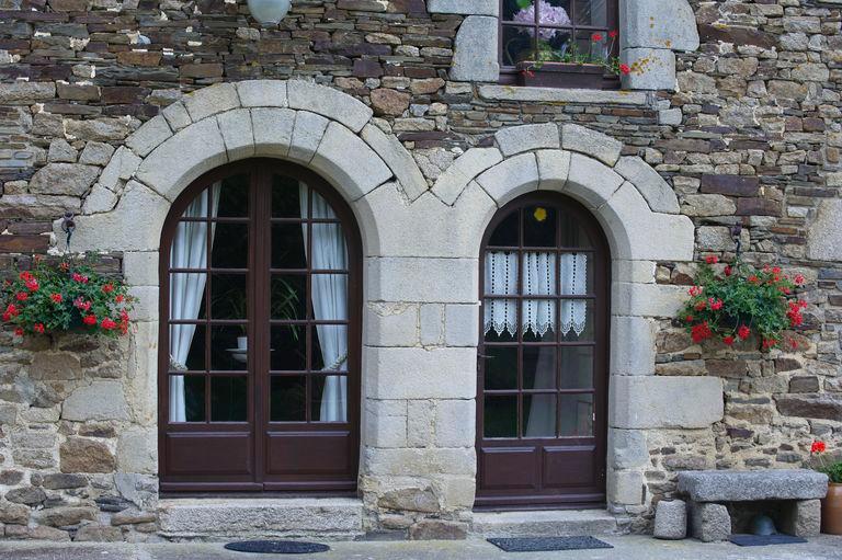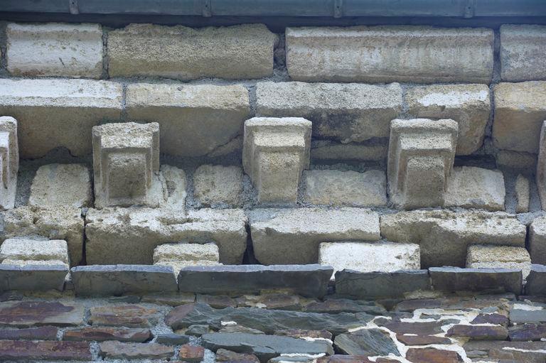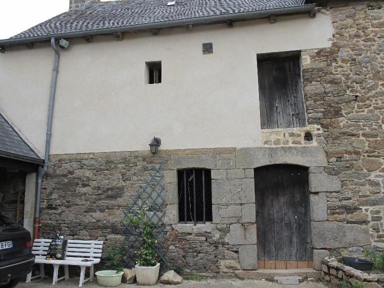 L’hétérogénéité des matériaux, granite, schiste, falun et terre constitue une caractéristique de cet ensemble de bâtiments qui rend compte à la fois par sa mise en œuvre de différentes campagnes de construction et du savoir-faire des maçons. Les plus belles maisons rurales de ce secteur proche du pays des Faluns se parent de belles corniches et souches de cheminées sculptées en calcaire coquillier. Les reprises de maçonnerie en schiste devaient être à l’origine masquées par un enduit.