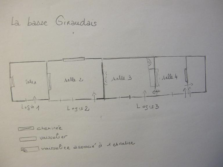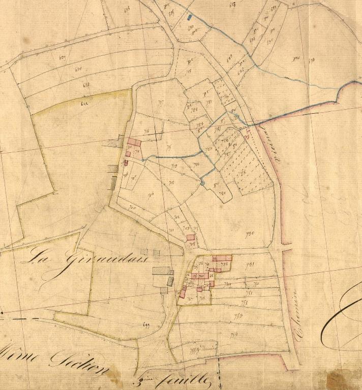 Situé au sud de la commune, le village de la Giraudais est constitué d’une quinzaine de logis, pour la plupart mentionnés sur le cadastre de 1833. Une chapelle frairienne de plan rectangulaire, non localisée (voir parcelle 702) est attestée en 1792, date de sa vente comme bien national. Le cadastre ancien fait apparaître un ruissellement à l’est de l’écart avec deux petits bassins circulaires. Le plus excentré a pu servir de routoir pour le traitement du chanvre qui est abondamment cultivé dans ce secteur, sous l’Ancien Régime.