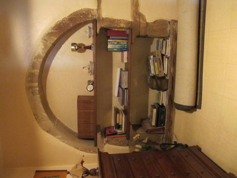 Enfin, le troisième logis, à l’est, reconstruit à la fin du 17e siècle en schiste sur des bases plus anciennes comprend trois pièces en rez-de-chaussée, vraisemblablement deux salles et une dépendance ayant chacune une porte d’entrée sur la cour. La dernière pièce à l’est dont l’entrée en plein cintre est plus petite n’était pas une pièce habitable. Elle était autrefois éclairée par un petit jour d’étable ou de cellier. La présence d’une chambre à l’étage témoigne également ici de l’aisance de son propriétaire qui affiche sur sa façade sa notabilité : riche corniche sculptée, en pierre de taille des faluns, doublée d’une rangée de trous de boulins pour abriter les pigeons.