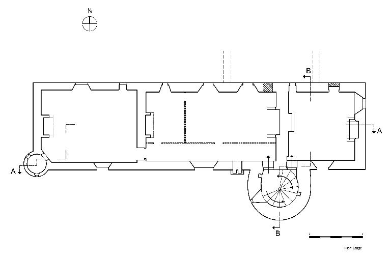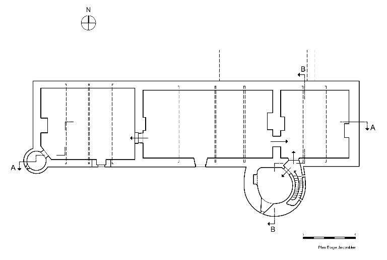 On accède à l’étage par un grand escalier en vis en bois dont les premières marches sont en pierre de taille de granite. L’ample espace de circulation se combine avec un repos dont l’usage semble être d’ordre défensif puisqu’il facilite l’accès à la meurtrière qui protège l’entrée. Un escalier secondaire creusé dans l’épaisseur du mur de la tour permet de se rendre à une petite chambre haute chauffée qui a pu servir de pièce de gué.Les murs très épais de l’escalier posent question, de même que la volée de marches qui se poursuit bien au delà de la porte de la vis secondaire. Ceci semblerait indiquer une transformation de l’arrivée primitive de l’escalier en pièce haute vraisemblablement dans la deuxième campagne du 16e siècle.