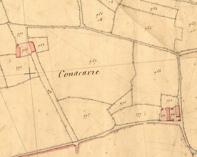 Les registres des matrices cadastrales de 1809 et de 1844 signalent une unique propriété pour les deux logis de Couacave. En 1844 ils appartiennent à la famille Tahier de Dinan. En ce lieu étaient également mentionnés en 1779 Joseph Lemarchand, trésorier de la paroisse, et en 1571 Robert Bagot, sieur de Couacavre, marié avec Jeanne de Marandes. L’un des logis en place se distingue par le remploi d’éléments du 16e siècle dont un linteau de porte orné d’un fronton triangulaire avec coquille et candélabres qui rappellent le répertoire décoratif de la Renaissance. Il a été transformé à la fin du 17e siècle puis aux siècles suivants comme pour le logis situé plus au nord à l’arrière de celui-ci. De nouvelles dépendances sont construites postérieurement au cadastre de 1844 et indiquent probablement une division de la propriété à la fin du 19e siècle.