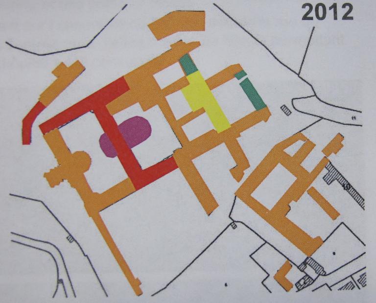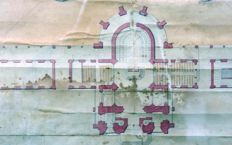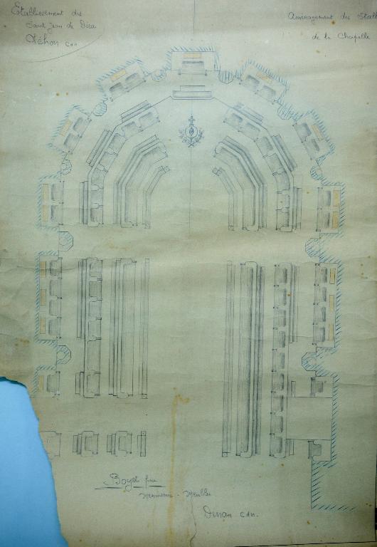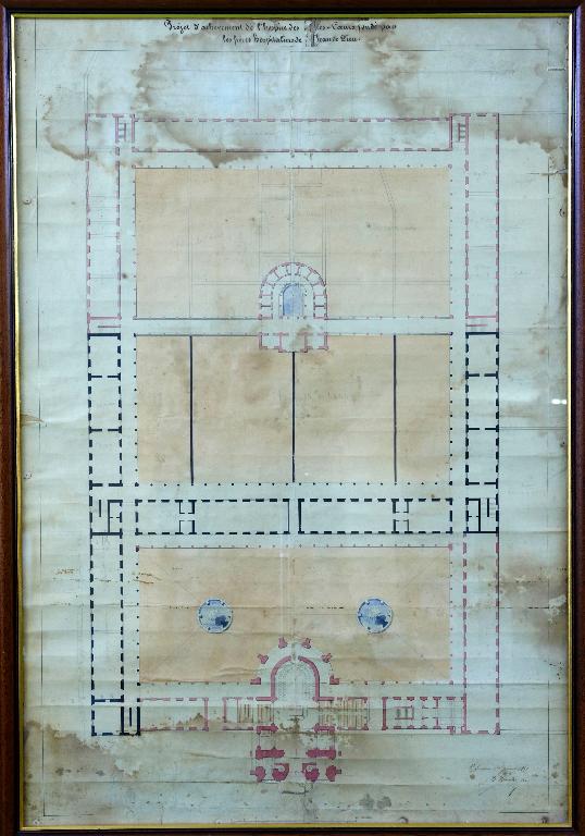 Les bâtiments de l’hôpital s’organisent autour de cours fermées selon une classification des patients, en usage au milieu du 19e siècle. A savoir, la condition sociale, la nature des maladies, les habitudes et manifestations « tranquilles », « agités », la guérison « incurables », « convalescents ». Le projet de 1851 de l’architecte Hawke est annoté au crayon gris de quelques précisions sur les différentes affectations des bâtiments et cours. Ainsi autour de la 1ere cour qui encadre la chapelle sont notés pour l’aile nord, une chapelle provisoire et pour l’aile sud une aile
