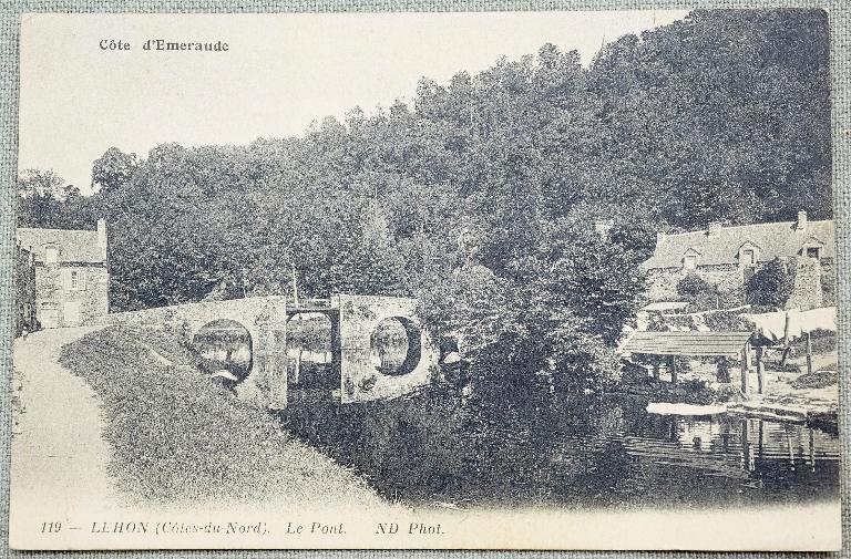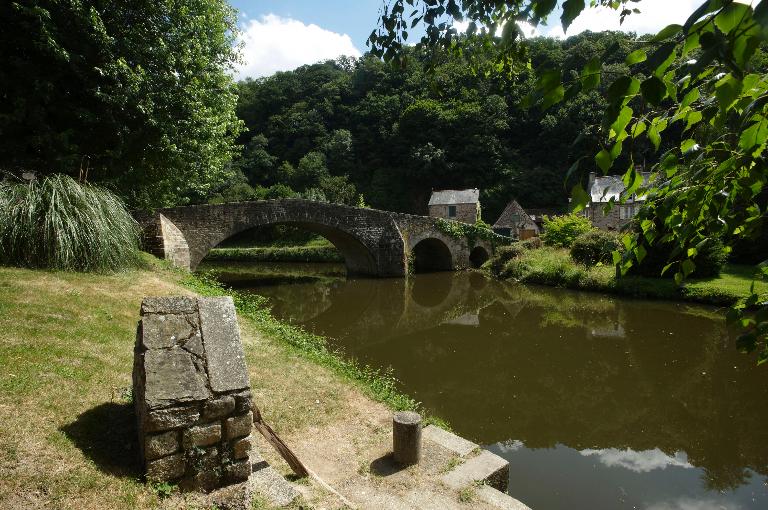 Dès la période romaine, il existait un gué sur la Rance. Vers le 10e siècle, il sera remplacé par un pont en bois par les moines qui s’établirent sur place, puis plus tard par un pont en pierre entre le 15e et le 16e siècle. Dès 1701, celui-ci est qualifié de ruineux et nécessite de solides réparations. L’arche centrale sera détruite en 1799 sur ordre du général Tribout pour arrêter le passage de l’armée vers Dinan. Une passerelle servira de transition jusqu’en 1832, époque à laquelle elle sera remplacée par un pont métallique. Le pont de nouveau détruit en 1944 sera reconstruit en pierres en 1946.