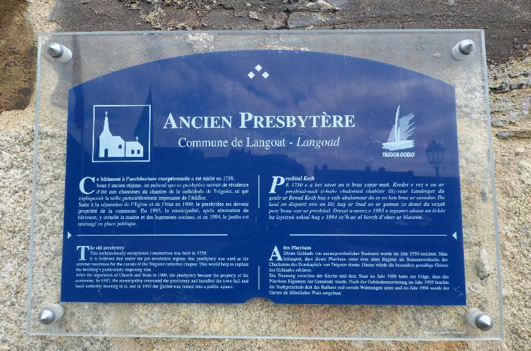 Le presbytère de Langoat a été reconstruit en 1786. Selon un aveu du 2 décembre 1786 cité par Jean LE GRAND (2002) : "Furent présents : Vénérable et discret Ollivier Paris, prêtre recteur de la paroisse de Langoat et Messire Guillaume Bescond, curé de la paroisse, demeurant au manoir presbytéral. Le dit manoir a effectivement reçu lors de sa construction en 1786 les dispositions et proportions voulues pour donner logement à plusieurs prêtre". Au rez-de-chaussée, les poutres de la grande salle porte l'inscrition latine : "Sic vos, non vobis" qui signifie : "Ainsi vous travaillez...et ce n'est pas vous".