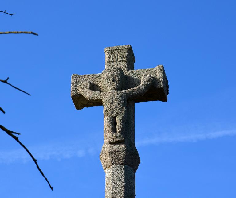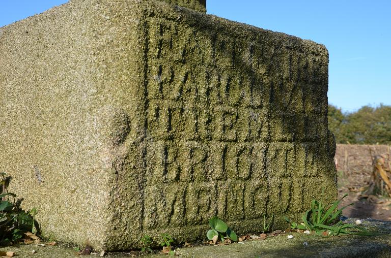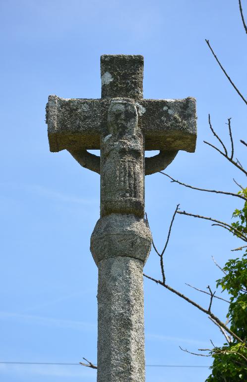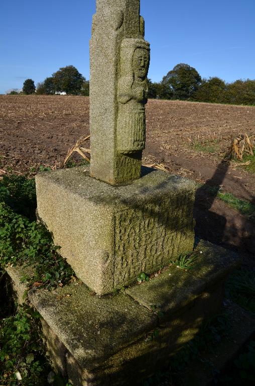 Édicule daté de 1810. Il a été réalisé à la demande de Olivier TREMEL et Brigitte Menguy (mariés à Langoat en 1786). Emmarchement à trois degrès, socle cubique, portant le millésime "1810" (au nord) et une inscription : "FAIT FAIRE / PAR OLIVIE [R] / TREMEL / BRIGIT[T]E MEMGUI (à l'est). Le socle supporte une croix monolithe au fût carré puis octogonal en granite gris. A l'avers, vers l'est, le Christ, représenté mort : tête droite, corps pendu par les bras obliques, les jambes droites, de facture frustre ; avec le titulus "INRI" (C'est l'acronyme, dit titulus crucis, de l'expression latine Iesvs Nazarenvs, Rex Ivdæorvm qui signifie "Jésus le Nazaréen, roi des Juifs". Au revers, vers l'ouest : la Vierge, main jointe portant son enfant. Sur le fût : représentation de la Vierge couronnée à trois fleurons, main jointe portant son enfant et une inscription "MAU (?) / LEN (?)".