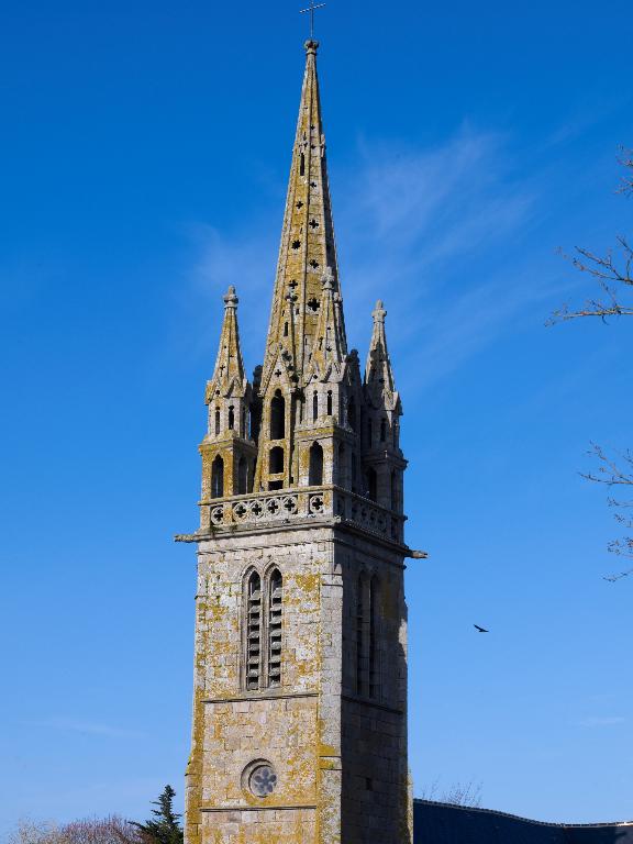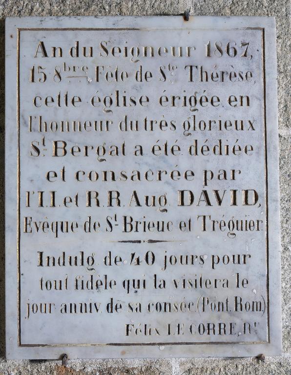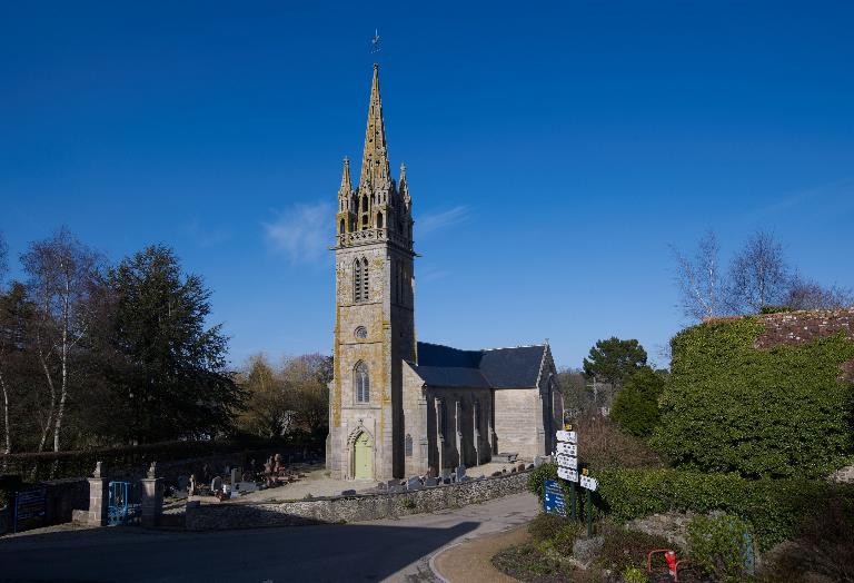 L'église paroissiale Saint-Bergat est édifiée en 1859, à l'emplacement de l'ancienne église figurée sur le cadastre ancien de 1835. De style néo-gothique rayonnant, elle est construite sur les plans de l'architecte Cangilly, par les entrepreneurs Gonery et Kerleau. La tour du clocher est réalisée dans un second temps, entre 1866 et 1867, sur les plans du recteur l'abbé Le Gorre.