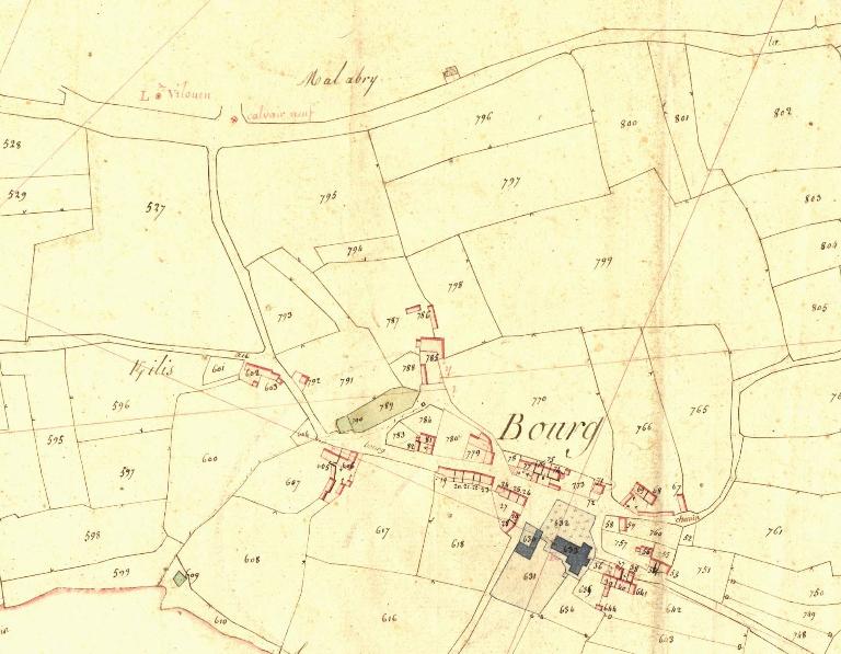 Au nord-ouest de l'église paroissiale, le petit lotissement de la fin du 20e siècle relie le bourg au carrefour des Quatre Vents, encore inhabité en 1835.