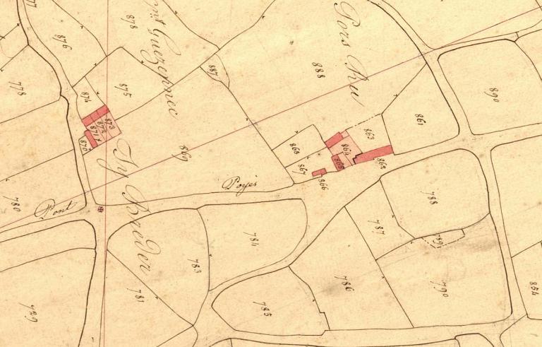 Porz Ru (IGN), "Porzh Ru" en breton signifie littéralement la "Cour Rouge". Logis orienté vers le sud, vraisemblablement datable de la 2e moitié du 16e siècle ; modifié en 1669 (date portée sur le linteau), au 20e siècle (percement dans la façade arrière et porte ancienne murée) et au début du 21e siècle (élargissement d'une fenêtre). Il figure sur le cadastre de 1836.