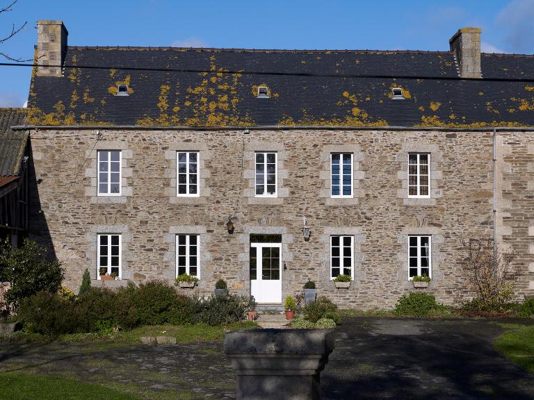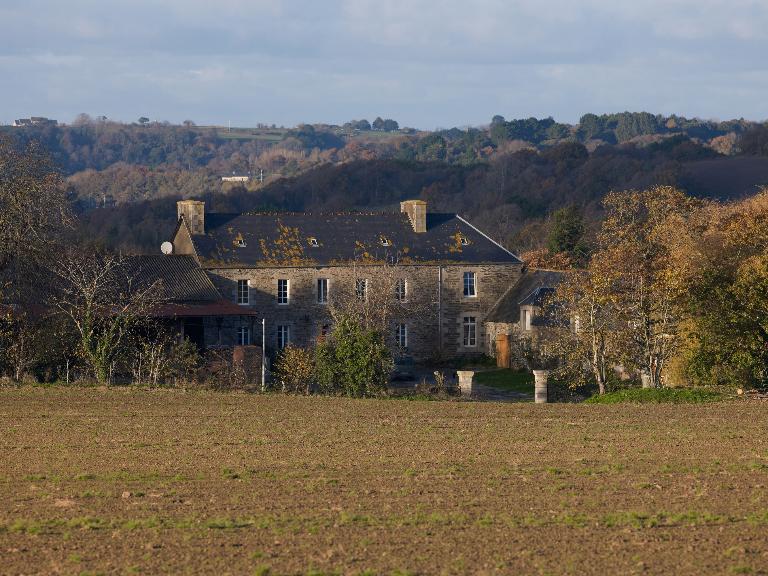 Grande ferme à cour fermée par une longue dépendance à usage d'étables, des murs d'enclos et un portail monumental. La mise en oeuvre associe moellons de schiste, de grès schisteux et encadrements de baies en granite. Le corps de logis principal, à élévation ordonnancée et plan simple en profondeur, est doublé d'un appentis postérieur. Un corps secondaire est construit dans l'alignement, à travée unique et plan double en profondeur, couvert d'un toit à croupe. Au rez-de-chaussée, la cuisine est doublée d'une pièce de réception qui a conservé son décor intérieur d'origine : cheminée en marbre avec sa glace, lambris d'appui, placards muraux, porte tiercée surmontée d'un fronton cintré orné d'une tête de cerf en ronde-bosse, embrasure de fenêtre à revêtement en bois, plafond mouluré.