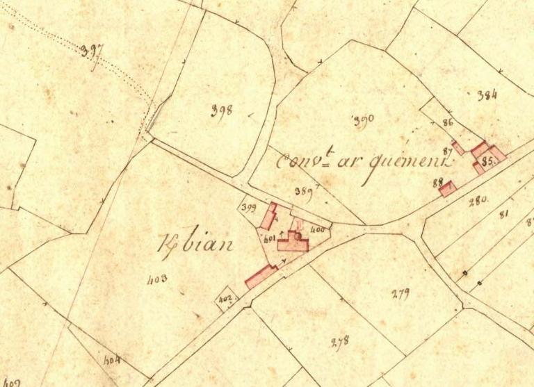 Cette ferme pourrait être une ancienne métairie noble de la seigneurie de Troguéry dont les vestiges subsistent à 800 mètres environ au sud-ouest (Kerino). La forme et la hauteur du bâtiment, la présence d'un blason muet sculpté sur le linteau de la cheminée du rez-de-chaussée militent en faveur de cette hypothèse. Le logis est construit dans la seconde moitié du 17e siècle ainsi que l'étable située à l'arrière, à l'ouest. La tour d'escalier postérieure en hors-oeuvre figurée sur le cadastre ancien a aujourd'hui disparu. Un nouveau logis est édifié en alignement en 1830 (date portée), raccordé au vieux logis comme l'atteste l'interruption de la chaîne d'angle. Le corps en retour d'équerre dessiné sur le cadastre ancien à l'arrière du logis 1830 a également disparu ainsi que la grande dépendance au sud.