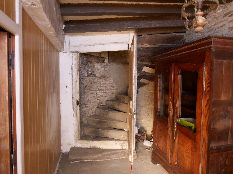 Ferme composée d'un logis, d'une grange et d'une remise construits en alignement. La cour est divisée en deux par un mur de clôture destiné à séparer la cour, où vaquent les animaux, de l'aire à battre située devant la grange et la remise. Le logis de plan allongé à étage carré est desservi par un escalier en vis en demi hors-oeuvre situé au fond du couloir d'entrée, dans l'axe de la porte. Placards muraux, niche et emplacement de charnier sont ménagés dans le mur de refend à droite de l'entrée, éclairés par un jour percé dans la façade. Deux pièces à feu situées de part et d'autre du couloir de distribution complètent le rez-de-chaussée. La grange possède un comble à haut surcroît.