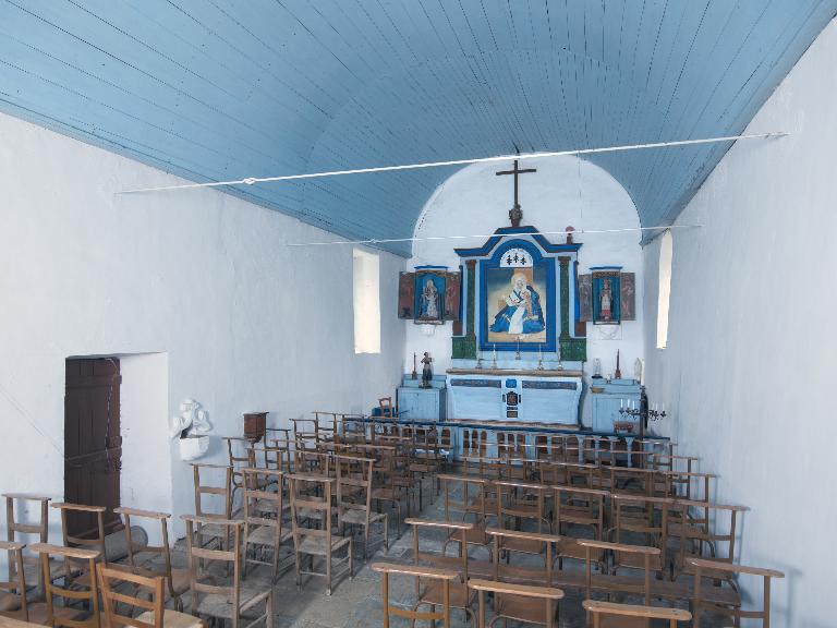 Chapelle de plan allongé à nef unique et chevet plat, construite en moellon et en pierre de taille de schiste et de granite, couverte d'un toit à pignon découvert. Clocheton en pierre à l'aplomb du pignon ouest. Voûte lambrissée peint en bleu azur, sol dallée de granite et de schiste.