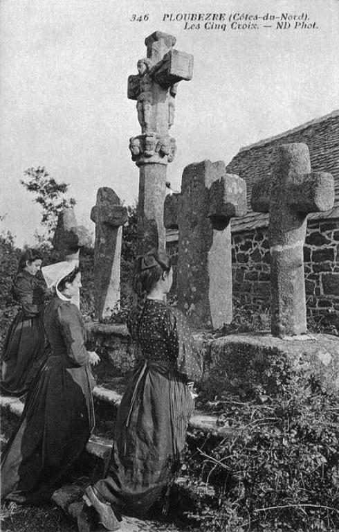 Les Cinq Croix de Ploubezre ont été illustrées par de nombreuses cartes postales. La "légende locale" veut que cet édicule ait été "élevé par les habitants de Ploubezre pour commémorer une victoire remportée par Geoffroy de Pontblanc sur les Anglais"en 1345.
