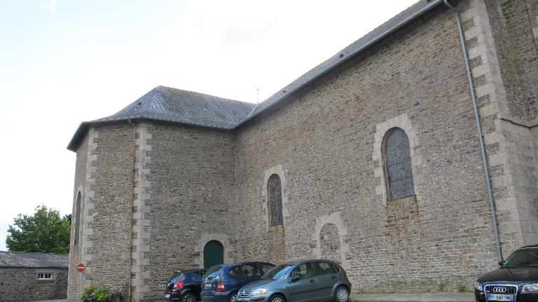 Le devis établit par l'architecte Jean-Baptiste Delarocheaulion ne fait aucune mention du programme, ni du style de l'édifice. Un plan simple en croix latine avec une tour clocher et une petite sacristie. Le granite des carrières locales de bonne qualité est requis. Le 1er mars 1844 a lieu la pose de la première pierre et lors de la messe de noël l'église est presque achevée, hormis son clocher terminé en 1847. Le mobilier est installé progressivement : en 1865, les autels latéraux, en 1866, un grand vitrail détruit par une tempête peu de temps après son installation. La verrière en place a été réalisé par les ateliers Loigneau de Saint-Brieuc. Le campanile avec sa toiture en carène a été également détruit par un incendie en 1920 et remplacé par une flèche d'ardoise en 1923.