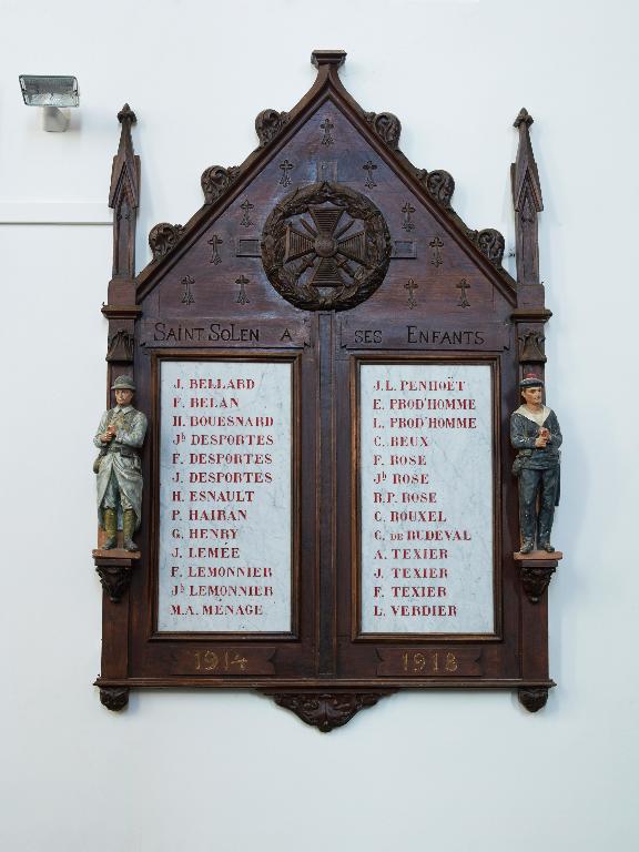 L'église saint Solen reconstruite entre 1877 et 1885 réemploie quelques éléments de l'ancienne église, une fenêtre du 14e siècle au revers du chevet, les fonts baptismaux et un bénitier du 17e siècle ainsi que deux statues du maître autel de Saint- Solen et de saint Fiacre datables du 18e siècle. A l'extérieur, a côté d'un iff remarquable se situe également une ancienne croix de cimetière datable du 17e siècle.