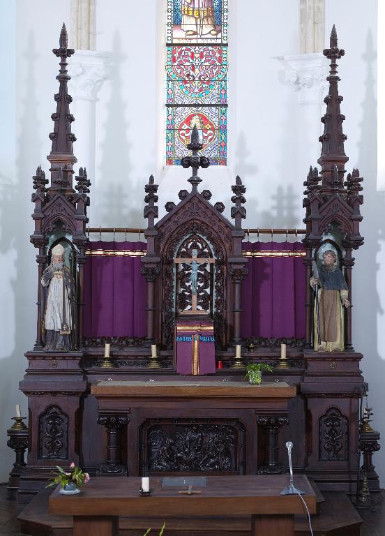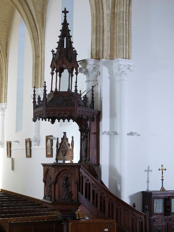 Église orientée. Reconstruite au même emplacement que l’ancienne église. Plan en croix latine à un seul vaisseau couvert d'une fausse voûte d'ogives prolongé par un chœur à pans coupés. Le clocher est situé en bas de nef.