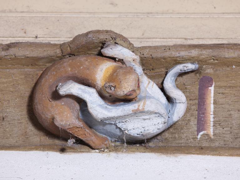 - une statue en pierre de kersanton polychrome de saint Jean Baptiste en peau de bête de mouton (datable du 15e siècle ou du début du 16e siècle) ou saint Jean aux pieds de porcs (?) (1,15 m) ;