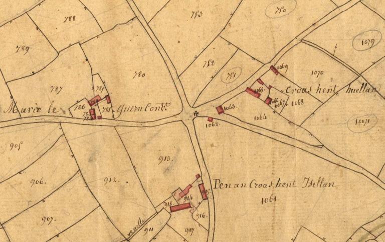 Édicule difficilement datable (Moyen Age : ?) figurant sur le cadastre de 1826 à son emplacement actuel et associé au toponyme "Croas Hent". Il s'agit d'une croix simple - nue, sur un emmarchement maçonné rudimentaire.