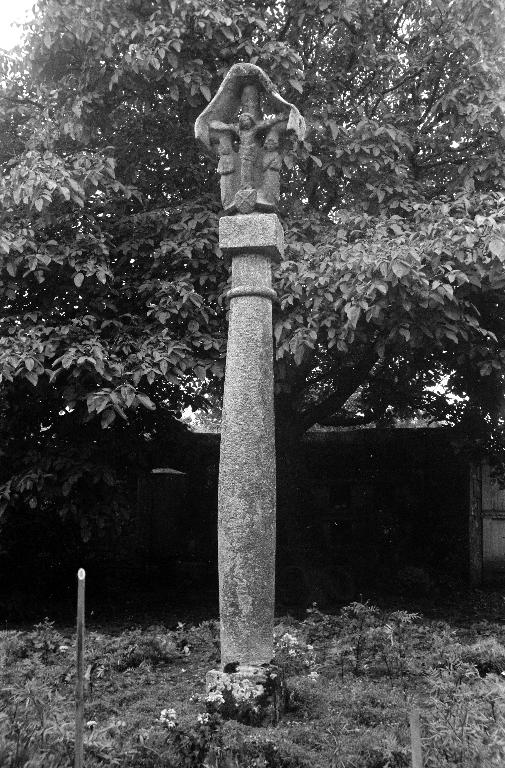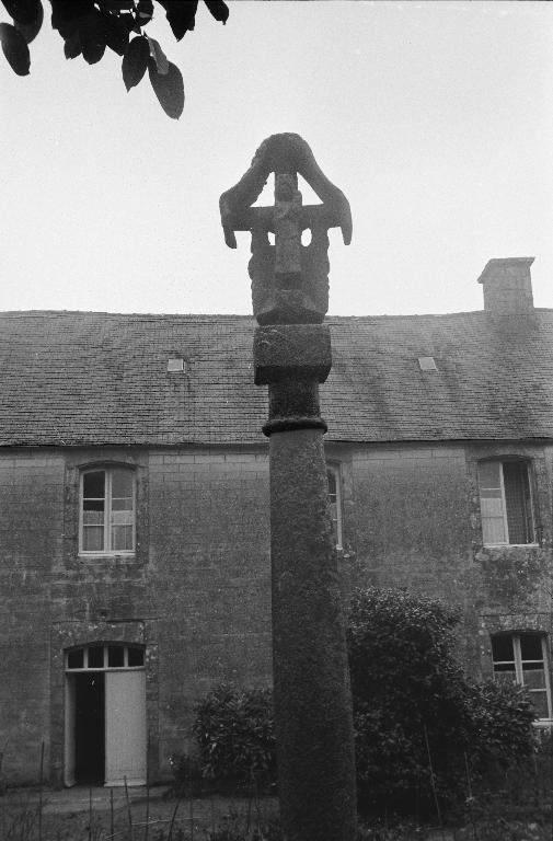 Croix historiée vraisemblablement datable du 15e siècle ou du début du 16e siècle. En 1969, présentée sur une colonne renflée (d'un montage relativement récent), cette croix - surmontée d'un voile en granite qui en fait sa spécificité, rappelle les croix à panneaux du Penthièvre ou du cimetière de Plouégat-Guérand dans le Finistère (datée du 14e siècle : ?). A l'avers : Christ en croix – représenté mort, accompagné de deux personnages – probablement Marie-Madeleine à gauche et saint Jean à droite. Le croisillon comporte en son milieu des armoiries (?). Au revers : Vierge à l'enfant, couronnée à trois fleurons. La croix a été déplacée près de la porte ouest de l'église paroissiale Saint-Pierre.
