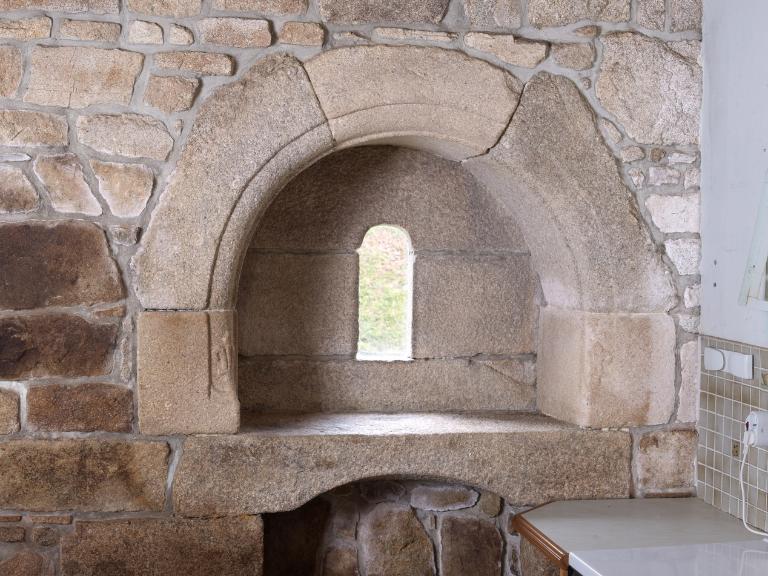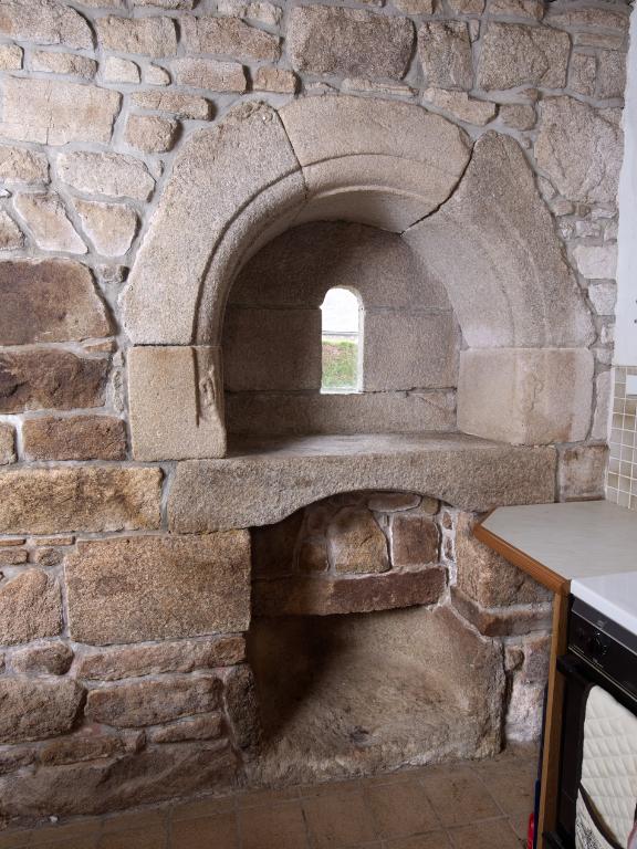 Linteaux et corbelets de cheminées sont le plus souvent en granite, quelquefois en bois et plus rarement en schiste comme à Convenant Le Moal. Des niches sont souvent aménagées de part et d'autre de la cheminée ou dans le contrecœur (mur de fond).