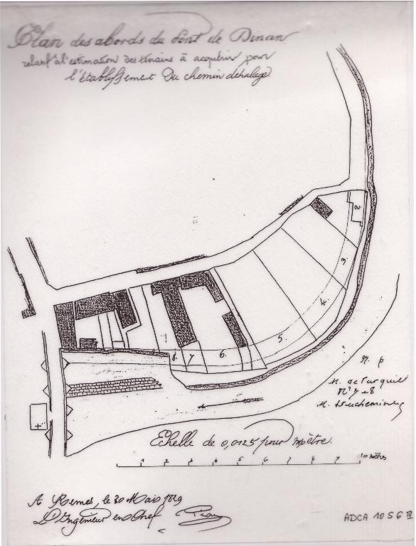 Le quai Hamon Ferron n'est pas construit en 1829 comme en témoigne «le plan des abords du Pont de Dinan relatif à l'estimation des terrains à acquérir pour l'établissement du chemin de halage». La construction de ce dernier est lié à la canalisation de la Rance dont les écluses sont mises en service en 1832. Des passages couverts sous le chemin de halage seront aménagés afin de permettre l’accès à l’eau aux tanneurs et blanchisseurs de la rue du Four.