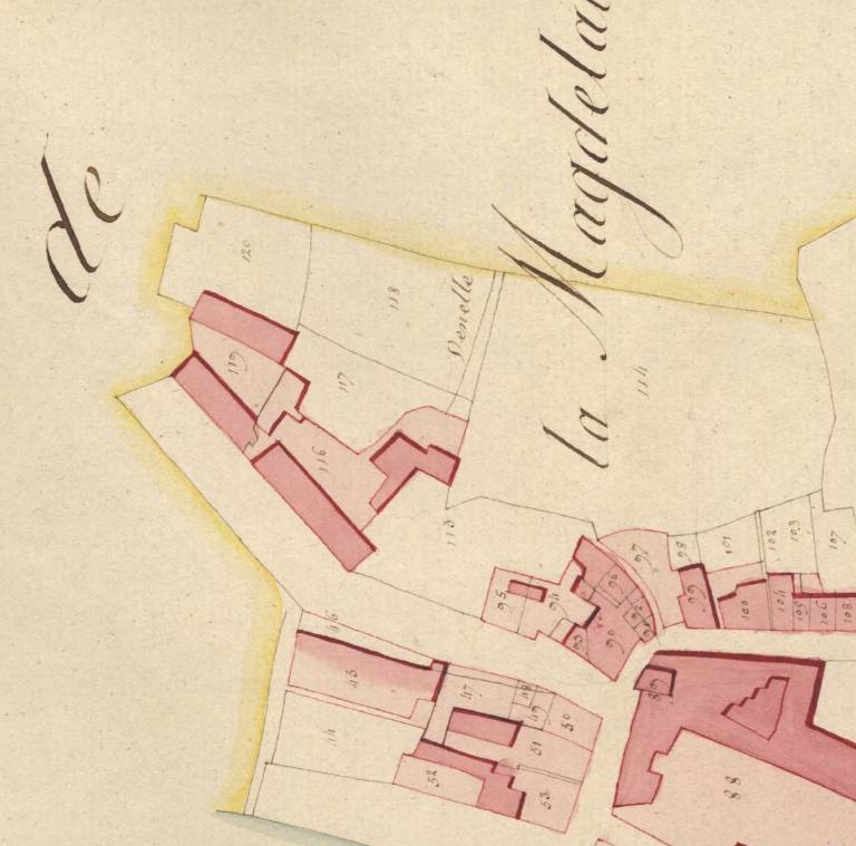 La première mention d'une auberge aux abords de la rue de la Madeleine apparait dans un acte de 1532. Elle appartient à “Jacques Tourondel tenant hostellerie au pont”. Elle prendra le nom au 18e siècle de “l'auberge du Croissant”. Celle ci semblait être située au 28 de la rue, selon un dessin anonyme de la fin du 19e siècle qui la représente avec sa large façade en pan de bois à double encorbellement sur la rue. Cependant, le plan du cadastre de 1811 ne fait pas apparaitre de bâti à cet emplacement. A t-il été oublié par le géomètre ?. Le cadastre de 1844 mentionne quant à lui quatre parcelles bâties ( de 47 à 50) dont les constructions sont démolies vers 1900.