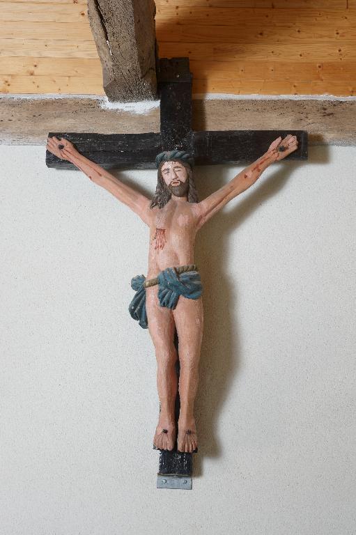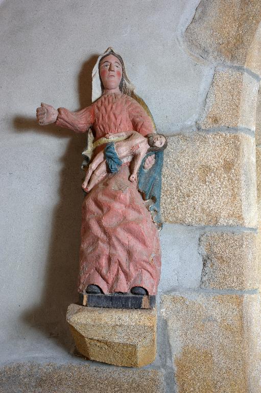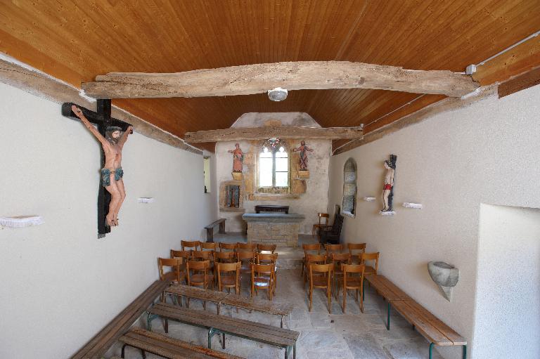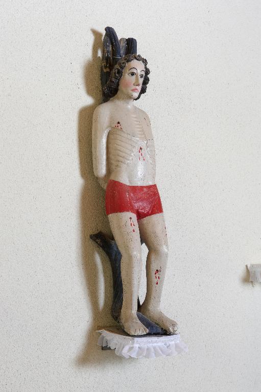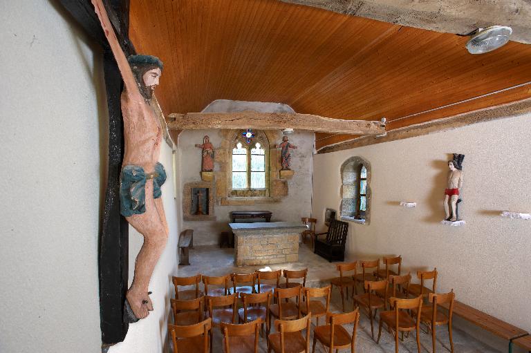 A l'intérieur : un Crucifix, une Vierge de Pitié (pietà), un saint Sébastien, une statue non identifiée (saint André ?) et un tronc ancien.
