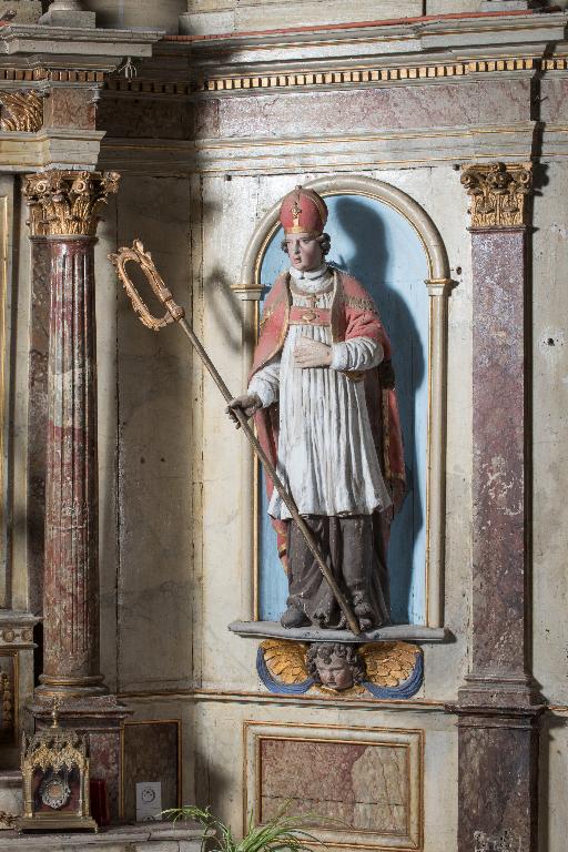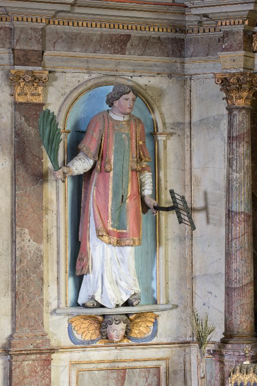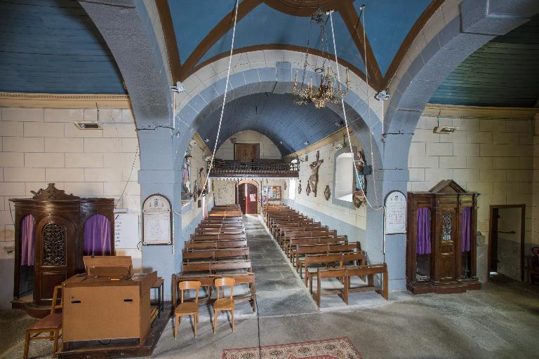 L´intérêt de l' édifice tient également dans le maintien d'un ensemble mobilier en partie protégé au titre des monuments historiques. Le retable principal, de tradition lavalloise, cohérent avec la date de 1706 portée sur l’arc diaphragme du chœur, repose sur un soubassement en granite solidaire de l’architecture du chevet. L'ancien baldaquin des fonds baptismaux également du tout début du 18e siècle a été déplacé au début du 19e siècle à l'intérieur d'une petite chapelle ajoutée alors au sud de la nef lorsque l’on a créé une tribune au revers de la façade ouest afin de gagner de l'espace dans l'église.
