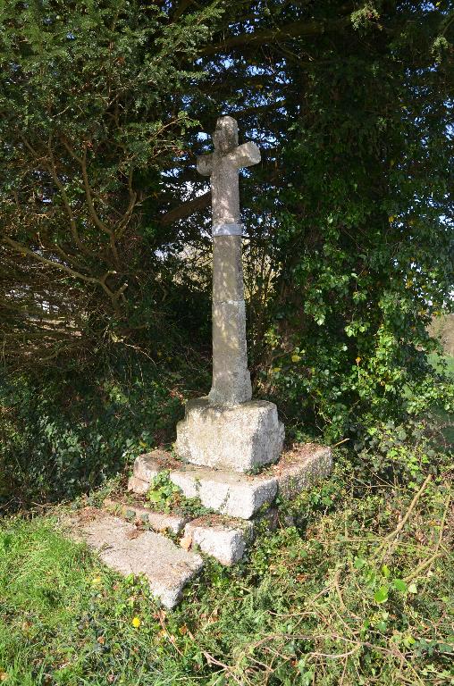 Emmarchement de forme carrée à trois degrés en partie enfoui dans la végétation (sous un if) et socle de forme cubique à griffes (angles abattus) ; fût brisé assez court et croix de section octogonale. A l'avers de la croix, est représenté, le Christ. La sculpture est très érodée.